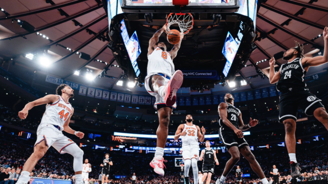 But the Knicks came out with FIRE and INTENSITY and raced out to a 22-11 lead. KAT was pounding the ball inside and hitting 3’s, and the Knick DEFENSE stifled the Nets — leading to fast break buckets by Hart, OG, Mikal, and Brunson.