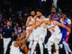 Jalen Brunson, Josh Hart, and Landry Shamet pushed back — Brunson with 3 buckets in a 9-2 run by NY that pulled them within 12 pts with 5 minutes left — at 109-97 NY.