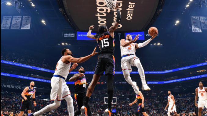 The Knicks came back twice from 12-pt deficits to tie the game at 101-101 with 2 minutes left, but the Suns’ intense defense in the final two minutes — slapping the ball away from NY to cause multiple Knick turnovers — enabled them to edge out a 112-107 win on a Friday night in Phoenix.