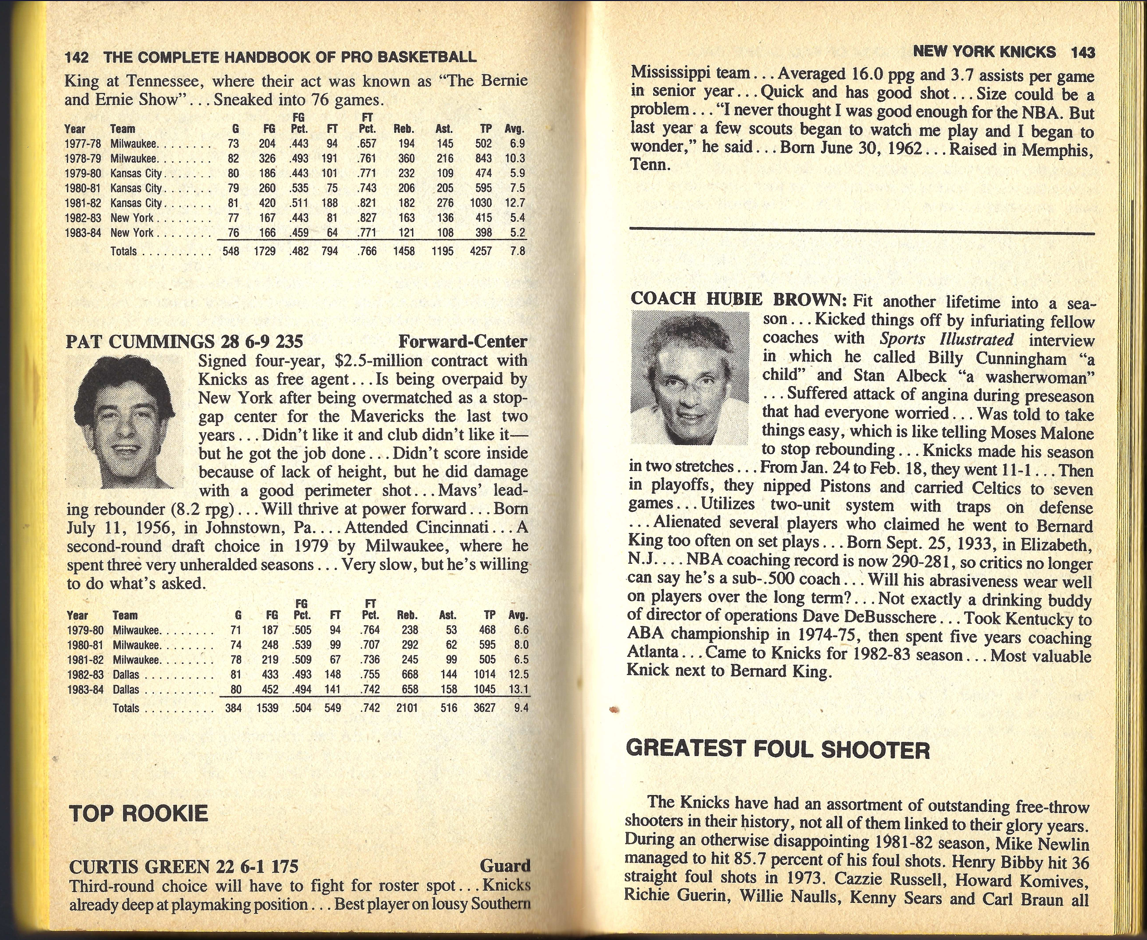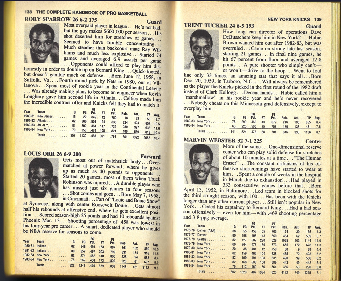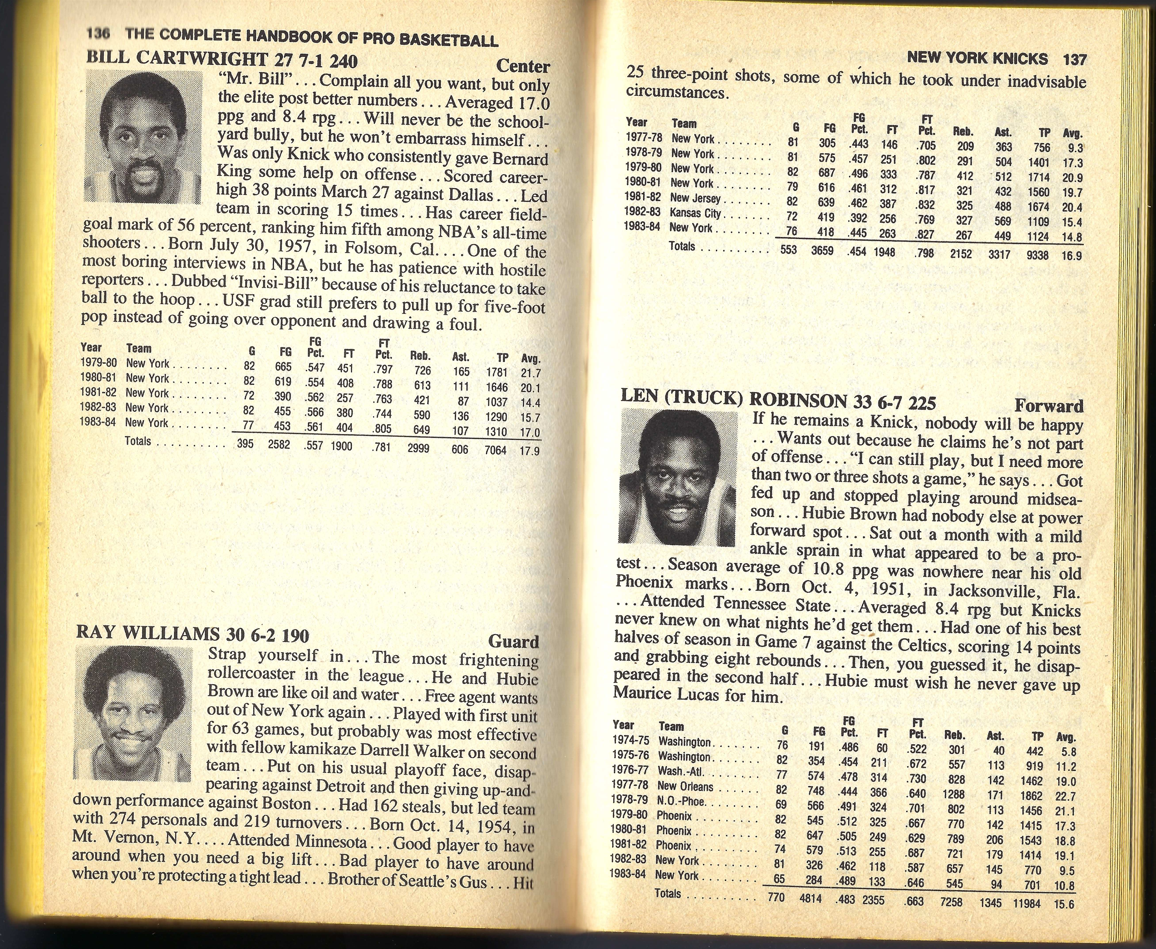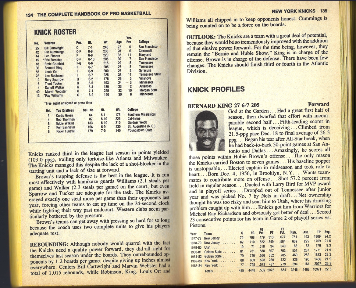 I’m providing here a sampling of the 1985 Handbook. I’m presenting the pages for the Knicks team — under Fair Use doctrine of Copyright law, and with perfect hindsight, will analyze Zander’s analysis. The book details the 1983-84 season, with the 1984-85 season about to begin.