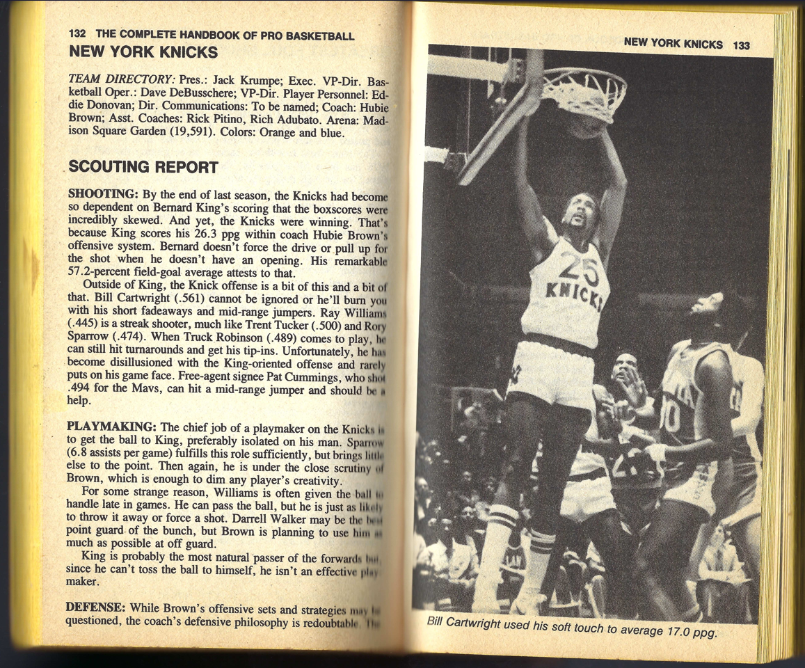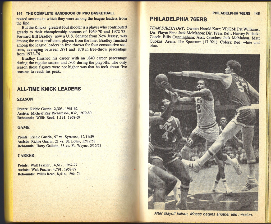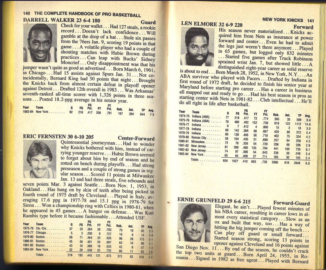 I’m providing here a sampling of the 1985 Handbook. I’m presenting the pages for the Knicks team — under Fair Use doctrine of Copyright law, and with perfect hindsight, will analyze Zander’s analysis. The book details the 1983-84 season, with the 1984-85 season about to begin.